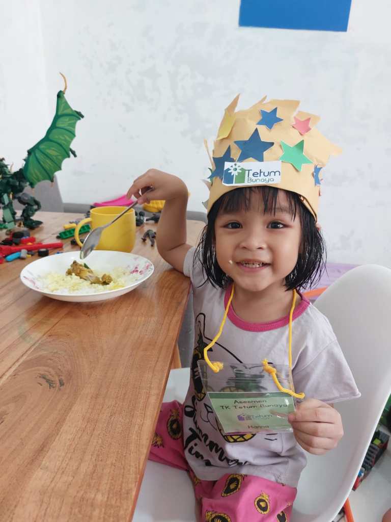 Ketika dibertahukan bahwa Hanna dapat tugas dari sekolah soal kemandirian, Hanna sangat antusias sekali. Dia meminta makan sendirinya sambil memakai topi yang diberikan pada saat assesment kemarin.