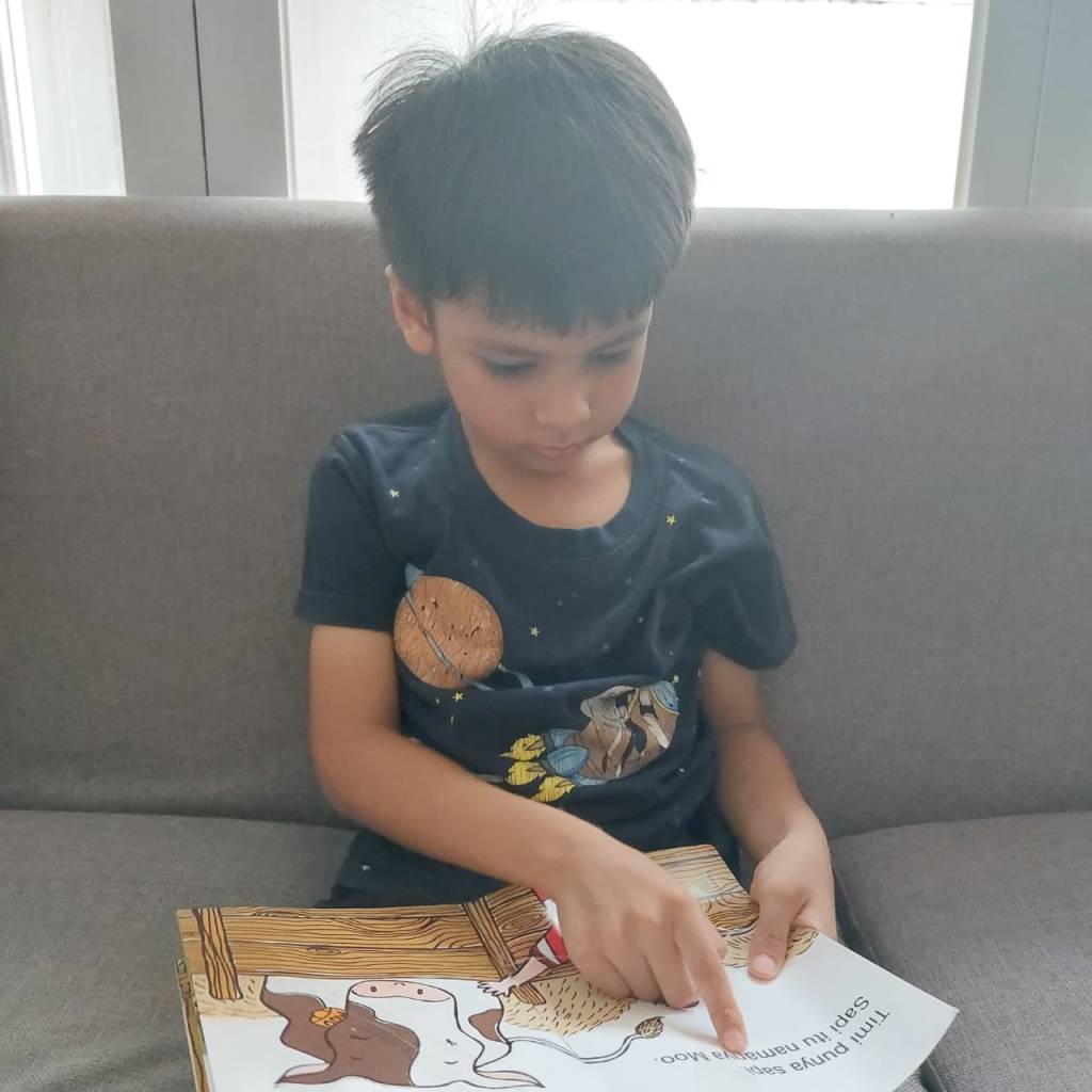 Saat ini Zahid Hanna memang sedang belajar Bahasa Inggris dengan aplikasi Monkey Stories. Jadi, saat ini sedikit-sedikit akan bertanya apa bahasa inggrisnya.